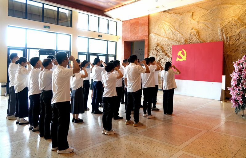 在安徽革命烈士事跡陳列館內,黨員同志們靜默肅立,面向黨旗,舉起右拳,新黨員入黨宣誓,老黨員重溫入黨誓詞,許下錚錚誓言。